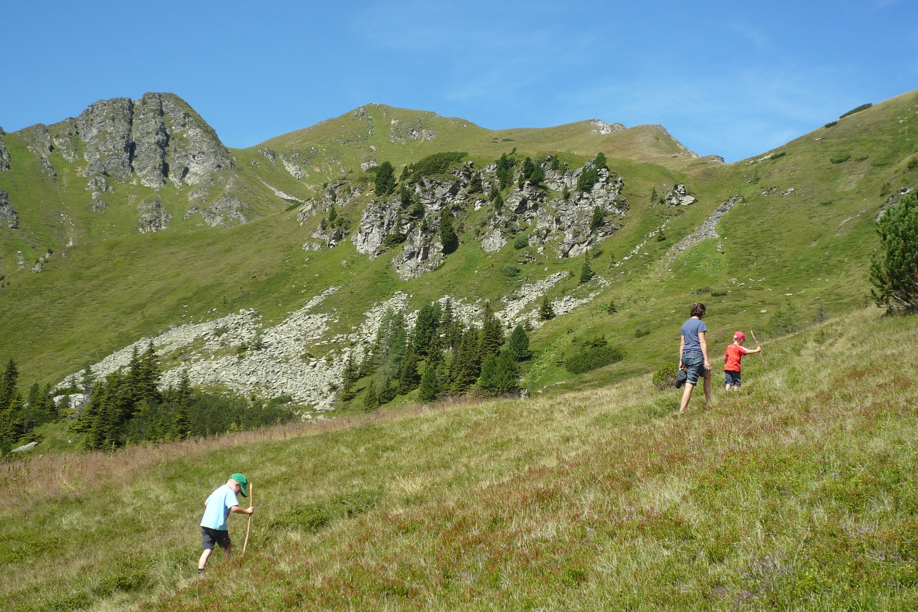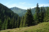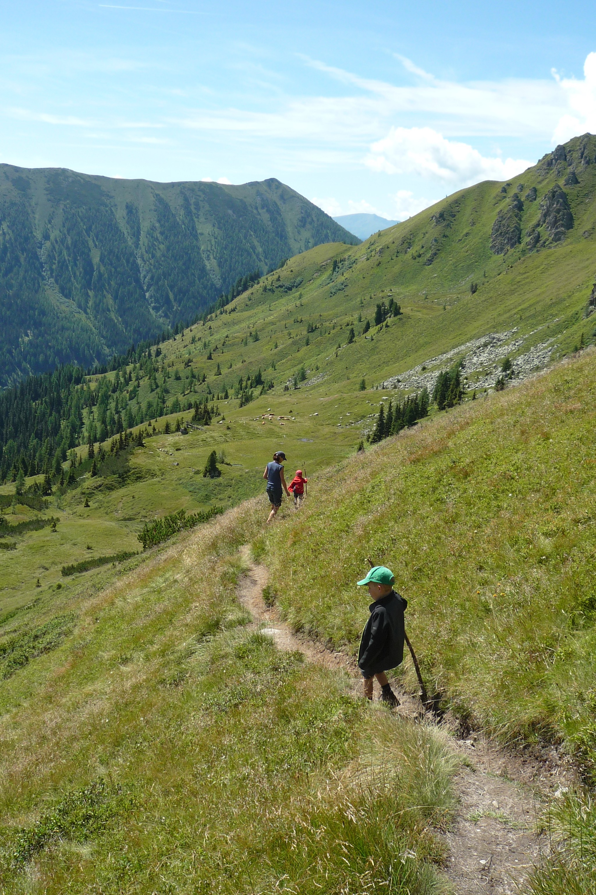 Odtud půjdete již po značené turistické cestě. Nejprve kousek dál hlavním údolím, později cesta odbočí vlevo do menšího údolí Frattental. Pěšinka se pěkně vine podél potůčku lesem, později stoupá horskými loukami, až vystoupíte na ploché sedlo Triebener Törl. Sedlo nabízí krásný výhled na okolní vrcholy a zubatý hřeben Ennstálských Alp na severu. Rovný a travnatý terén sedla je ideálním místem i pro stan, pokud byste chtěli strávit romantickou noc v horách. Spali jsme tu už v zimě i s dětmi v létě a vyrušit vás můžou jen pasoucí se krávy, které se v noci na sedlo stahují. V zářezu kousek pod sedlem naleznete příhodně i pramen vody. Kdo by chtěl pokračovat, ze sedla je možné vystoupit na vrcholy Sonntagskogel (2.229 m) a Gr. Grießstein (2.337 m) – viz horská túra č. 15 v následující kapitole. Sestup k parkovišti stejnou cestou.