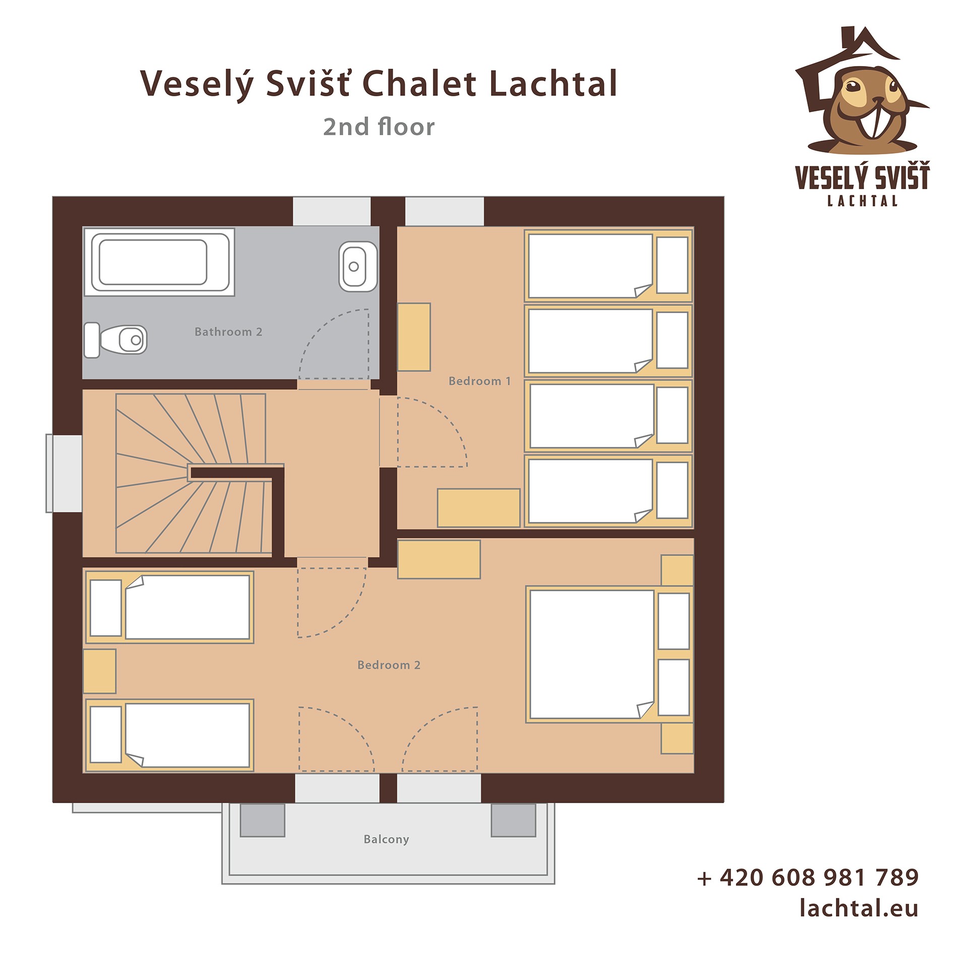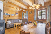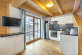 The new comfortable wooden Veselý Svišť Chalet in Lachtal can offer accommodation for 2 families or a group of up to 8 friends. On the ground floor of the chalet there is an open modern kitchen with a large dining table, a living area with a sofa as well as a TV with a DVD player, free WIFI. The pleasant atmosphere is enhanced by the wood burning stove in the middle of the room, so you can have breakfast or dine with radiant heat behind your back. There is access to a terrace from the kitchen with beautiful mountain views. On the terrace there is a table with benches and we prepare the grill for pleasant outdoor dining in the summer. On the ground floor there is also a bathroom with a shower and toilet, a hall with a boot drying rack and a ski storage room with a separate entrance from the outside. Upstairs there are two 4-bed rooms for sleeping and a second bathroom with a bath and toilet. In addition to the wood burning stove, there is modern electric infrared heating in the cottage with the possibility of controlling each heating panel separately. The hot water is heated by an electric boiler.