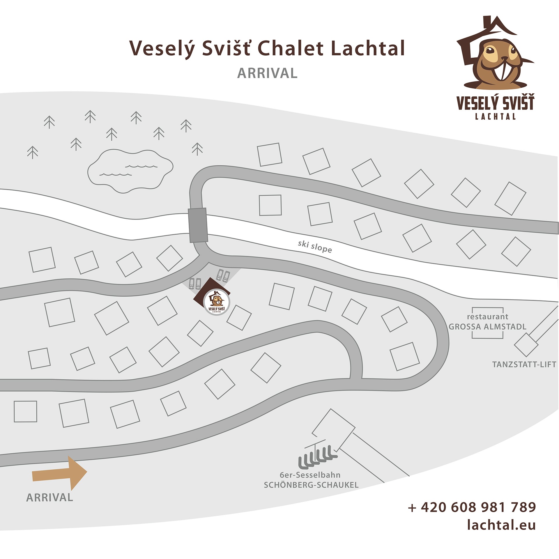 Upon arrival to Lachtal, take the first turn to the right and watch the signs for Sissi Park. The road will keep rising and when you arrive at the Sissi Park apartment complex, turn left into the tunnel below the ski slope and after a few hundred meters you will reach the Grossa Almstadl mountain restaurant. From the restaurant, go another 100 meters to the left up the hill and Veselý Svišť Chalet is the 5th chalet on the left side directly opposite the entrance to the next tunnel. You can park during throughout your stay directly in front of the chalet, where we have 4 of our own parking spaces. In winter, the roads are regularly cleaned, but have snow chains with you in the car, during fresh snow the hill to Lachtal and the final exit to the chalet can be a problem.