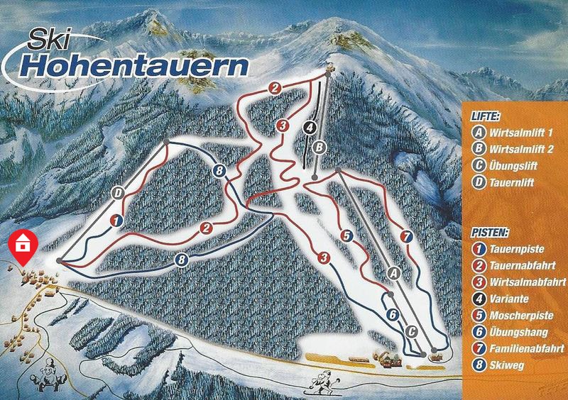 Přímo v Hohentauern je menší lyžařské středisko (1.250 – 1.750 m) s 8 sjezdovkami. Nejbližší vlek (D) je jen 200 metrů od chalupy, takže není problém dojít i s dětmi ke sjezdovce pěšky nebo se vrátit v poledne do chalupy na teplý oběd. U hotelu Moscher je pomalá dětská poma (C) se svahem ideálním pro učení dětí a krátký dětský jezdící koberec pro nejmenší. Často tu lyžujeme skoro sami, fronty jsou tu velkou vzácností. U horní stanice vleku je stylový lyžařský bufet Wichtehütte a dole u hotelu Moscher je půjčovna a servis lyží. Aktuální ceny skipasů je možné nalézt na oficiálním webu střediska.
