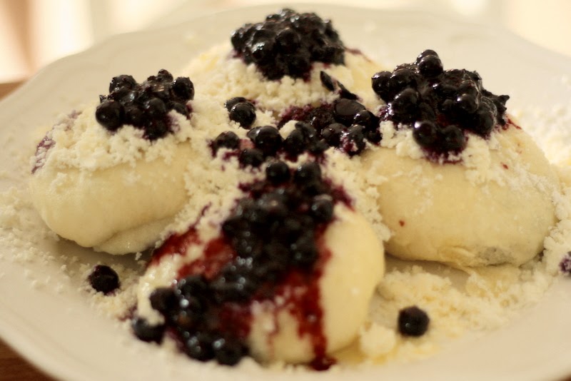 Zpracujeme těsto, které necháme asi hodinu kynout. Tvoříme knedlíky, vaříme 8 min buď ve vroucí vodě nebo v páře (na pařáčku, který lehce pomastíme, aby se knedlíky nelepily, nebo použijeme čistý látkový kapesník). Knedlíky sypeme cukrem, pokapeme máslem, tvrdý tvaroh na strouhání tu neseženete, měkký ano - Topfen).